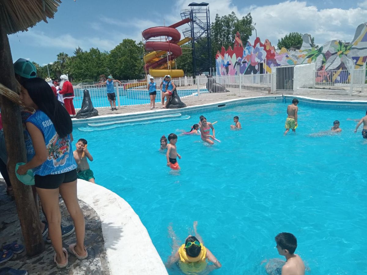 El balneario cuenta con una amplia piscina para adultos, otra destinada a niños y un sector con toboganes. Entre los atractivos más convocantes se destaca el parque jurásico, con esculturas de animales prehistóricos que captan la atención del público infantil. La propuesta busca combinar recreación, descanso y entretenimiento en un entorno natural.