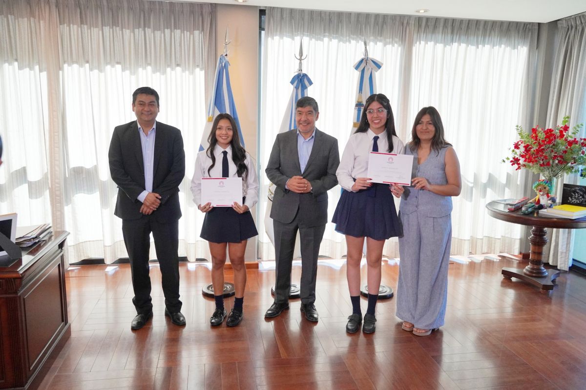 RECONOCIDAS POR AUTORIDADES DE LA LEGISLATURA. Malena Carabajal y Sofía Rodríguez, estudiantes de la Escuela Técnica N°1 de La Cocha, alcanzaron un promedio 10 en el último año. / Cortesía Malena Carabajal