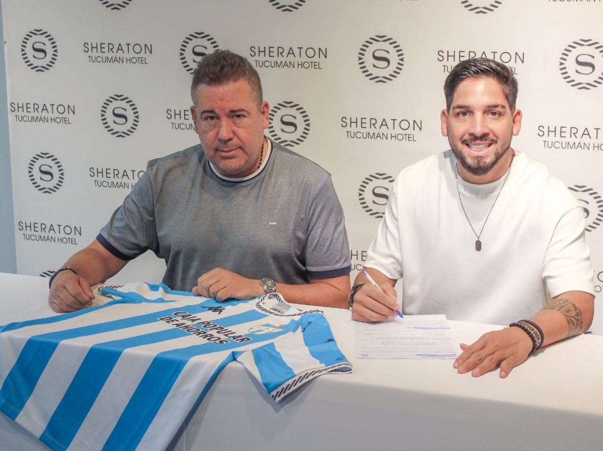 OFICIAL. Martín Benítez posa junto a Miguel Abbondándolo, secretario técnico de Atlético. El delantero firmó contrato hasta diciembre de 2026. Foto: Prensa Atlético Tucumán