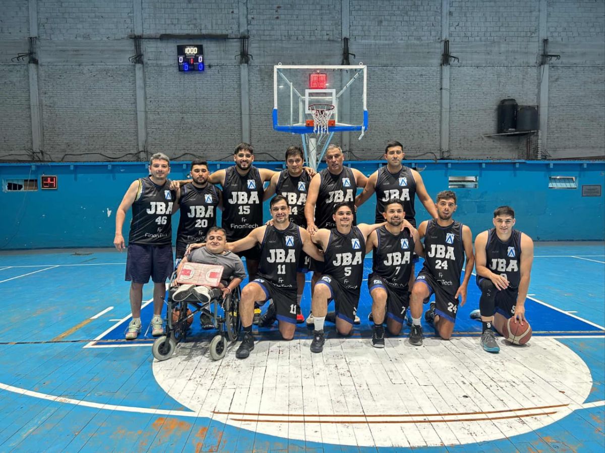 UNIDOS. Javier Pérez posa en una cancha de básquet junto al plantel de Juan Bautista Alberdi.