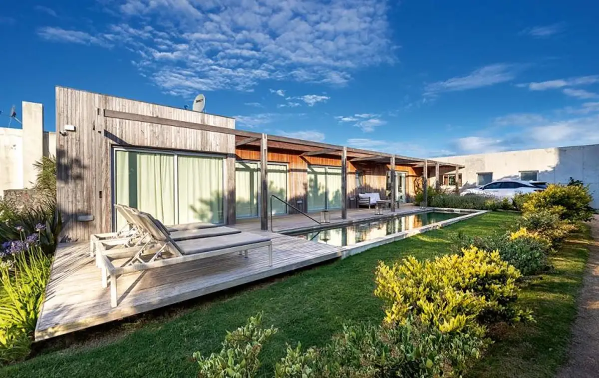 El exterior tiene un enorme parquizado con deck frontal. También hay espacios pensados exclusivamente para reuniones multitudinarias. Cuenta con terrazas laterales, vista al mar y piscina. También hay un sótano con garaje.