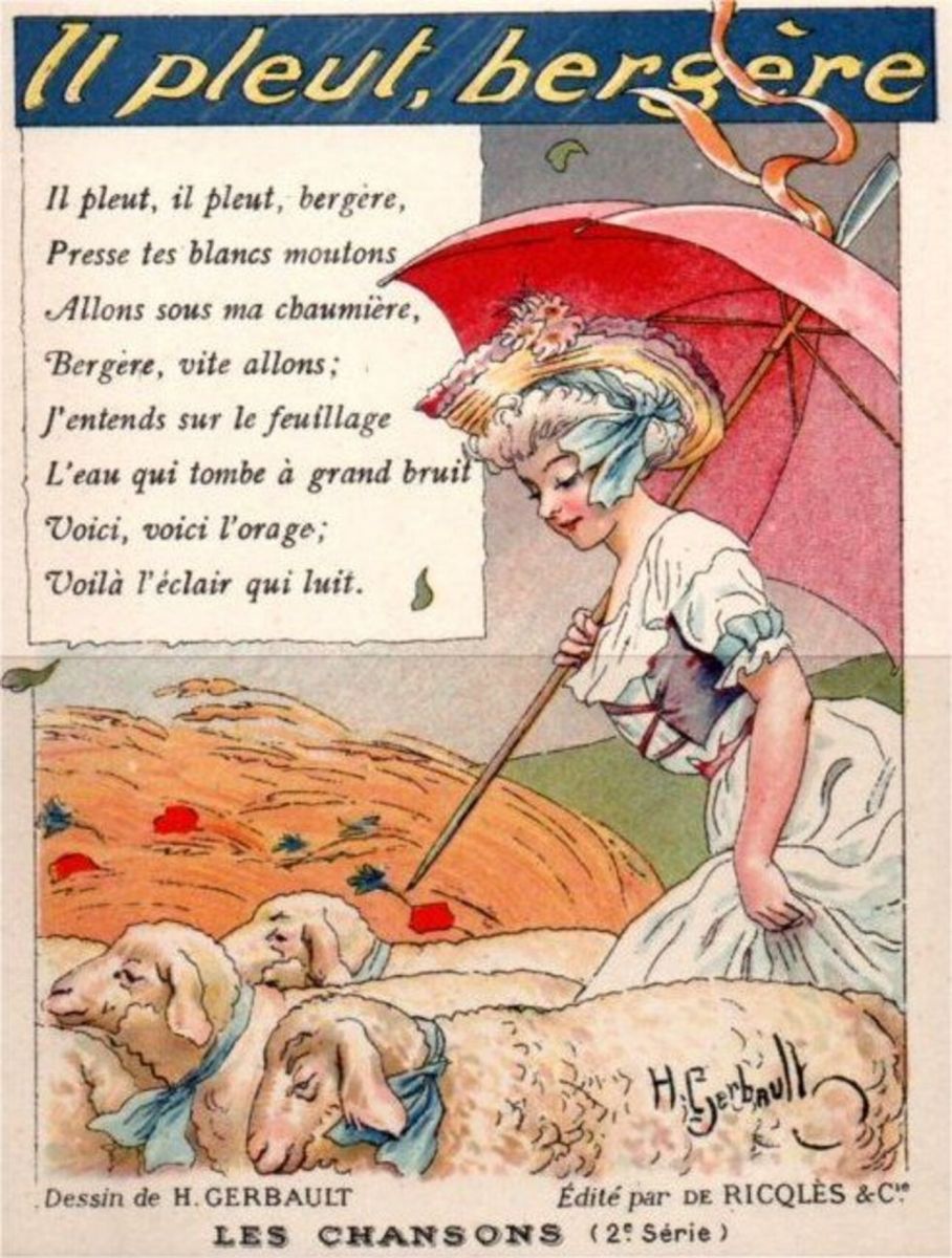 Il pleut, il pleut, bergère (llueve, llueve, pastorcita) es una mezcla de “arroz con leche” y “Mambrú”, una canción dulce pero a la vez terrible. ¿Quién no pensó, ya “de grande”, en las penurias con las que nos arrullaban, como aquellos maderos de San Juan, por caso, a quienes tan mal les va en sus reclamos de pan y derivados de la leche? ¿O repara en la forma perentoria que se planteaba ante el imperativo hipotético, la cláusula inmoral de premios y castigos que implicaba invocar al cuco para que se lo cene a uno, detrás de la inocente canción “duérmete niño”?