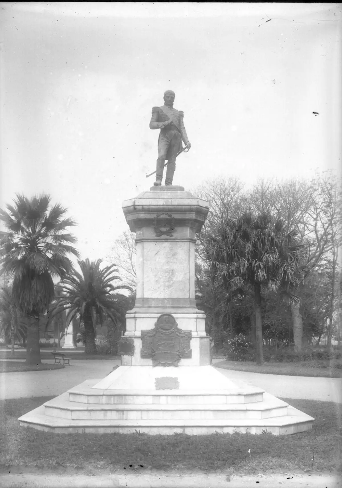 La foto fue tomada en 1935, tiempos en los que el Belgrano de Cafferata miraba al oeste, hacia los cerros. Hasta que en 1977 se levantó un murallón en la plaza, por calle Bernabé Aráoz, y dieron vuelta la estatua, por lo que Belgrano quedó mirando al este. También hubo un ida y vuelta con los cambios de pedestales. La vida del héroe siempre fue ajetreada en Tucumán.