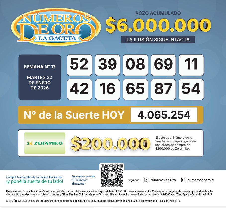 Números de Oro Los Números de Oro de LA GACETA del 20 de enero de 2026 Compartir Whatsapp Facebook X Copiar dirección URL Hace 10 Hs Seguir en Esta nota es de acceso libre. Temas EuropaUnión EuropeaNúmeros de Oro de LA GACETAWhatsAppMinisterio Público Tamaño texto Comentarios Lo más popular Las hipótesis del crimen: por qué mataron a Érika Álvarez y qué rol jugó el narcotráfico Lules, en emergencia por el temporal: el río arrasó la ruta y la intendenta reclamó “inversiones de fondo” Tragedia en Tucumán: cayó un auto a un canal y murieron tres personas La Policía detuvo al fotógrafo de LA GACETA que cubría el accidente cerca de Los Ralos Asesinato de Érika Álvarez: la tecnología frustró el plan de fuga de “El Militar” Cortan el tránsito en el kilómetro 10 de la ruta 307 por los daños que ocasionaron las lluvias