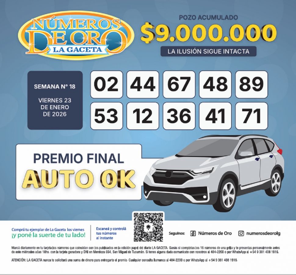 Números de Oro Los Números de Oro de LA GACETA Compartir Whatsapp Facebook X Copiar dirección URL 23 Enero 2026 Seguir en Esta nota es de acceso libre. Temas Números de Oro de LA GACETA Tamaño texto Comentarios Lo más popular La Provincia ratifica la suba en la cuota de la obra social: "En el Subsidio de Salud se hizo uso y abuso, venimos a sanearlo" Sube el combustible y se espera el impacto en los surtidores Tucumán sigue en alerta amarilla este sábado: se esperan lluvias y tormentas ¿Érika Álvarez fue amenazada antes de ser asesinada? Comenzó un plan de regularización dominial en Campo Norte Qué puede pasar si Donald Trump ordena un ataque a Irán