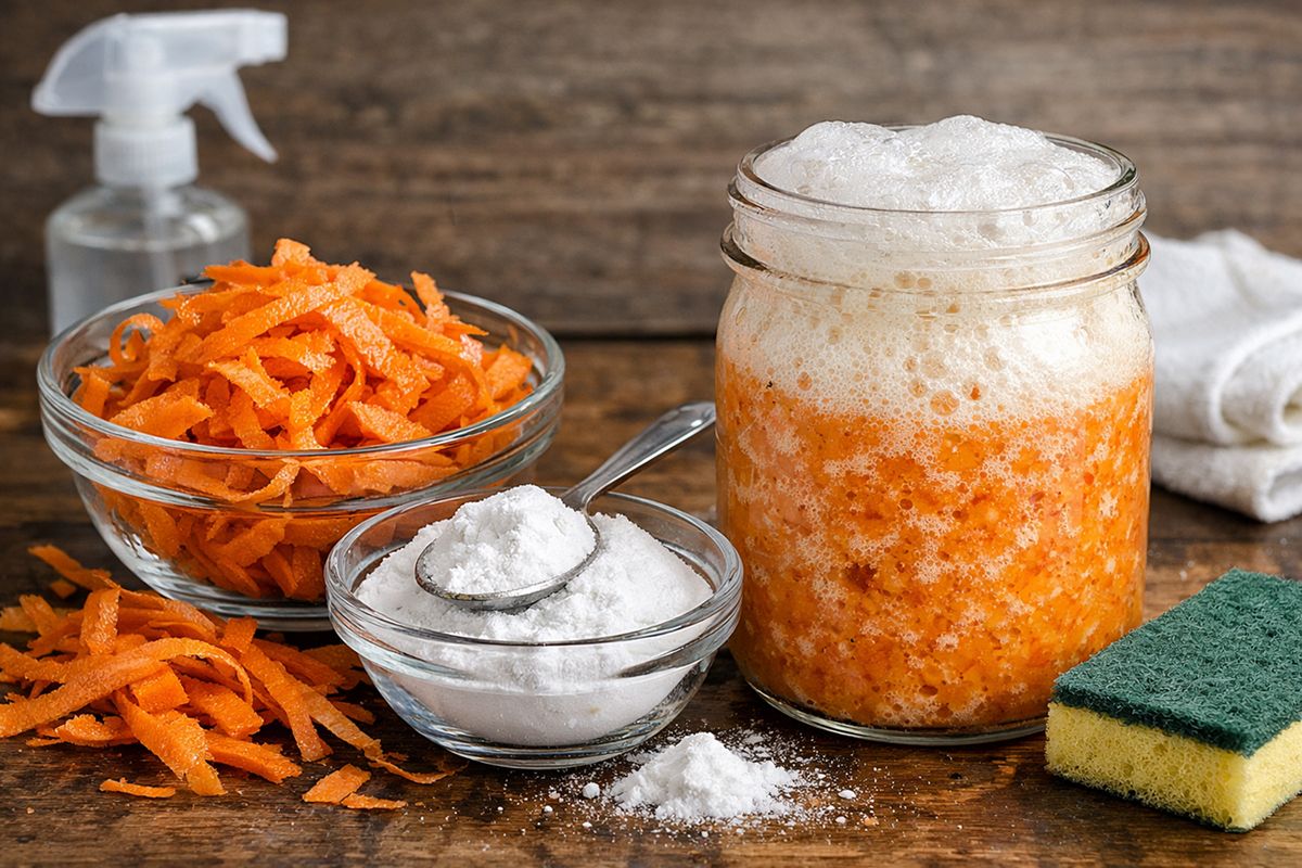 La cáscara de zanahoria tiene propiedades limpiadoras porque contiene aceites naturales y compuestos fenólicos que sirven para aflojar la suciedad. Tiene una acción desodorizante suave y aporta una textura fibrosa que ayuda a arrastrar residuos. El bicarbonato, por su parte, es un abrasivo suave que limpia sin dañar superficies y es un regulador de pH porque ayuda a desprender grasa y suciedad con facilidad.