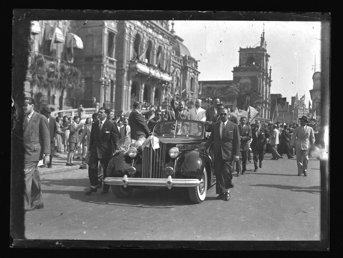 Con el brazo derecho en alto, a bordo del clásico descapotable, se recorta la inconfundible figura de Eva Perón. A su lado, de blanco -su sello distintivo- se ubica el gobernador Carlos Domínguez. El año es 1946; la escenografía, por demás identificable: la plaza Independencia.