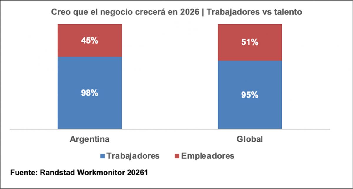 Entre los trabajadores, en cambio, el 45% espera una mejora en su situación laboral. Esta proyección muestra una postura más cautelosa que la del promedio global y evidencia una diferencia marcada entre la visión empresarial y la percepción del talento dentro del país.