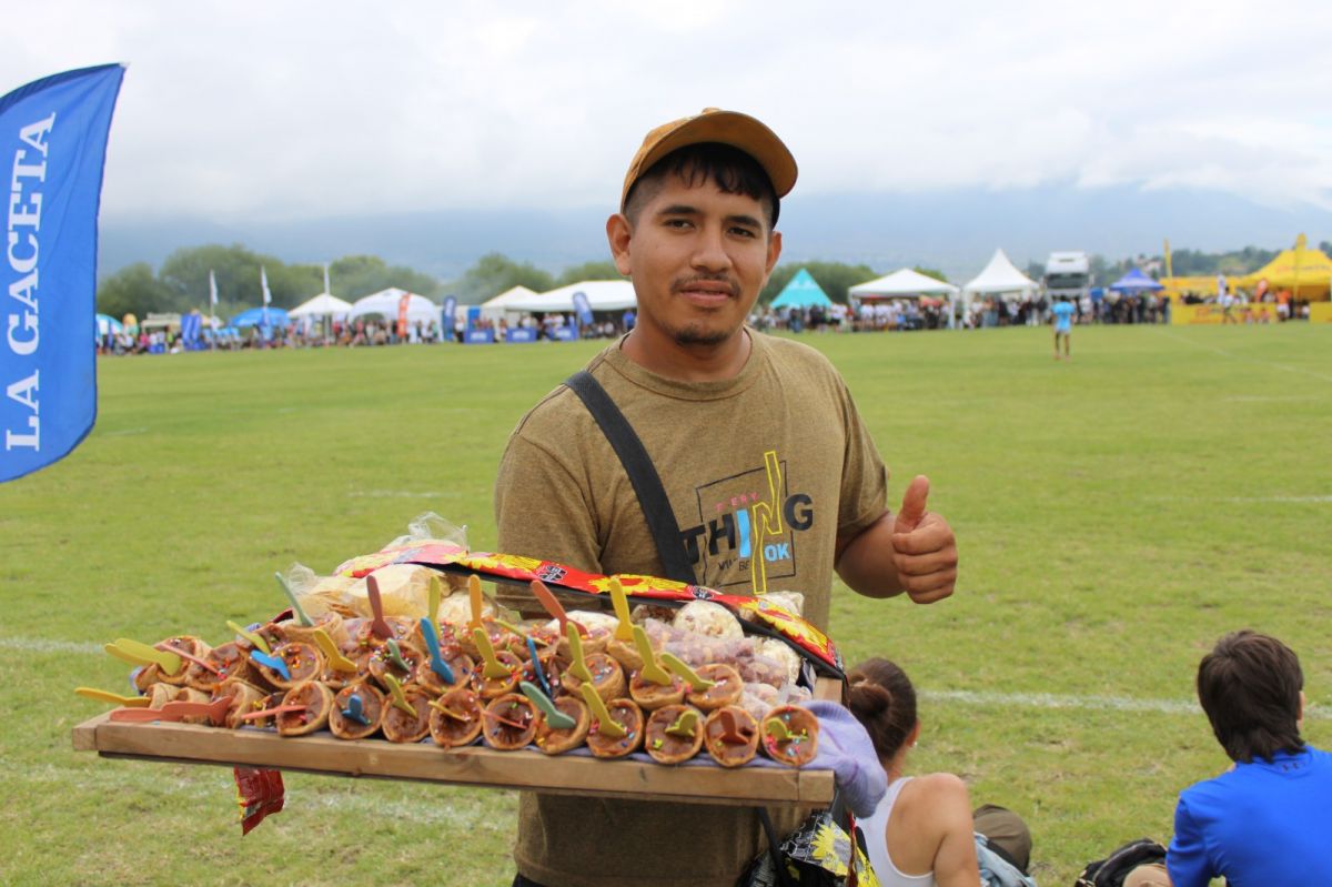 Mientras el público disfruta del rugby, del paisaje y del clima festivo, Catrel camina entre la gente ofreciendo lo suyo. No aparece en los programas oficiales ni en las fotos principales, pero forma parte del paisaje tanto como la cancha y las tribunas. Tiene 29 años, pero más de dos décadas de oficio encima. “Trabajo desde los ocho años”, repite, casi como una forma de ubicarse en el mundo.