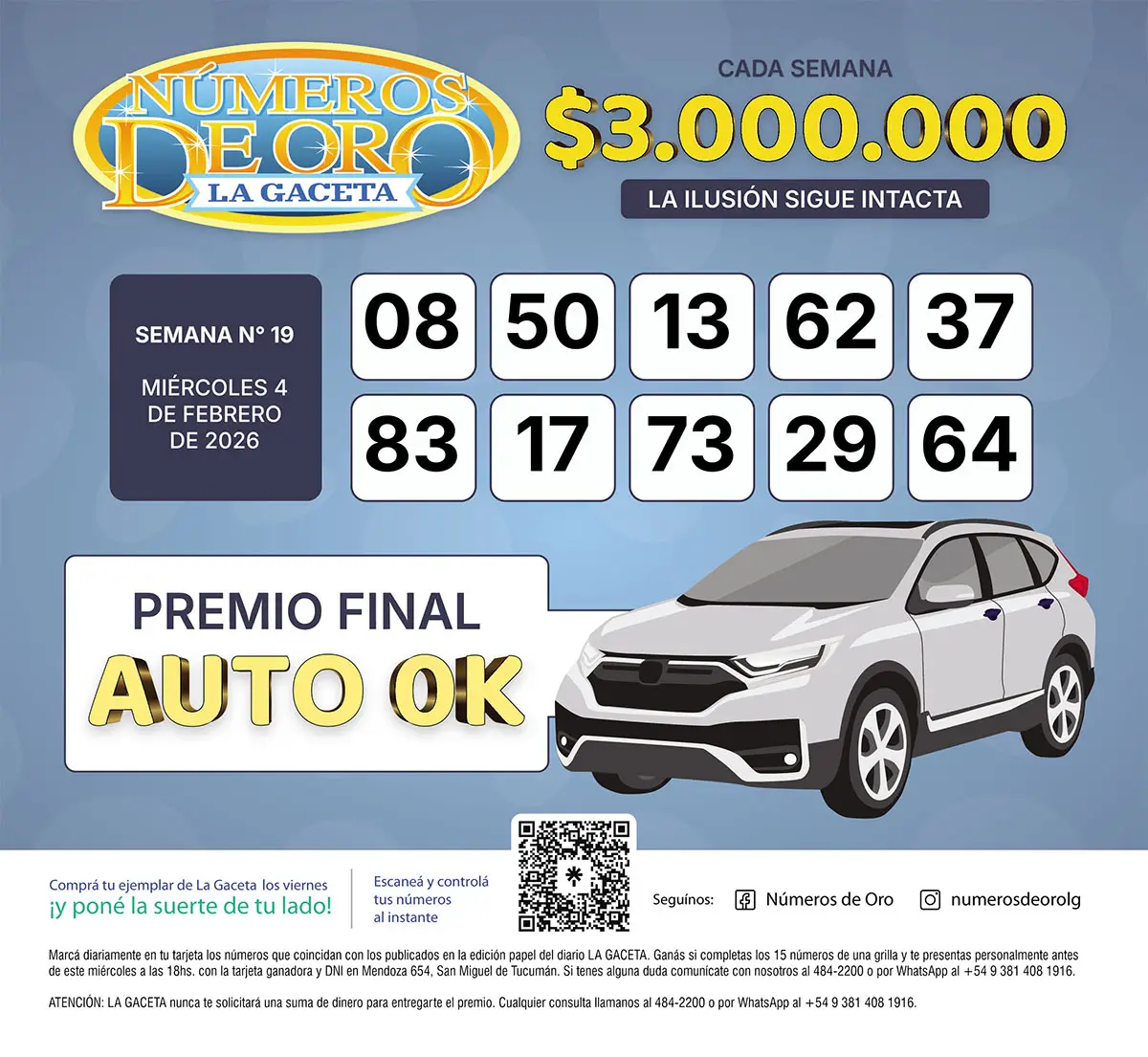 Números de Oro Los Números de Oro de LA GACETA del 4 de febrero de 2026 Compartir Whatsapp Facebook X Copiar dirección URL Hace 8 Hs Seguir en Esta nota es de acceso libre. Temas FacebookTafí del ValleNúmeros de Oro de LA GACETAWhatsAppSabrina RojasArgentina Tamaño texto Comentarios Lo más popular ¿Quiénes son y por qué hay más señalados en el caso Erika Álvarez? Una nueva etapa en la relación UNT-minería Cartas de lectores: gestión de inundaciones; dos enfoques Cartas de lectores I: desagües pluviales Cartas de lectores II: ingenuidad Cartas de lectores III: el Borges de Palermo, también en Tafí del Valle