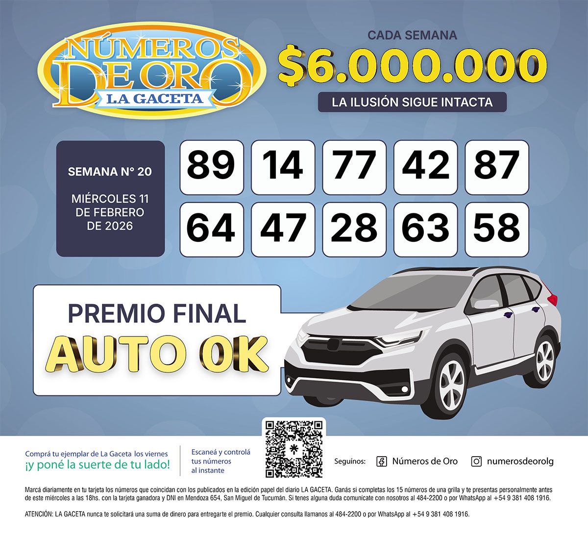 Números de Oro Los Números de Oro de LA GACETA del 11 de febrero de 2026 Compartir Whatsapp Facebook X Copiar dirección URL 11 Febrero 2026 Seguir en Esta nota es de acceso libre. Temas Números de Oro de LA GACETAWhatsApp Tamaño texto Comentarios Lo más popular Disfraces prohibidos y bailes en tiempos de guerra: así era el carnaval en Tucumán Más que 100 puntos Parker: el mensaje del vino tucumano que terminó tatuado en el brazo de una joven francesa Números de Oro: tres ganadores que ya piensan qué hacer con sus millones Bad Bunny en Buenos Aires: tres noches que prometen convertirse en historia en River Plate Espectáculos y cultura en Tucumán: guía para salir Cuatro tucumanos hicieron cumbre en el volcán activo más alto del mundo