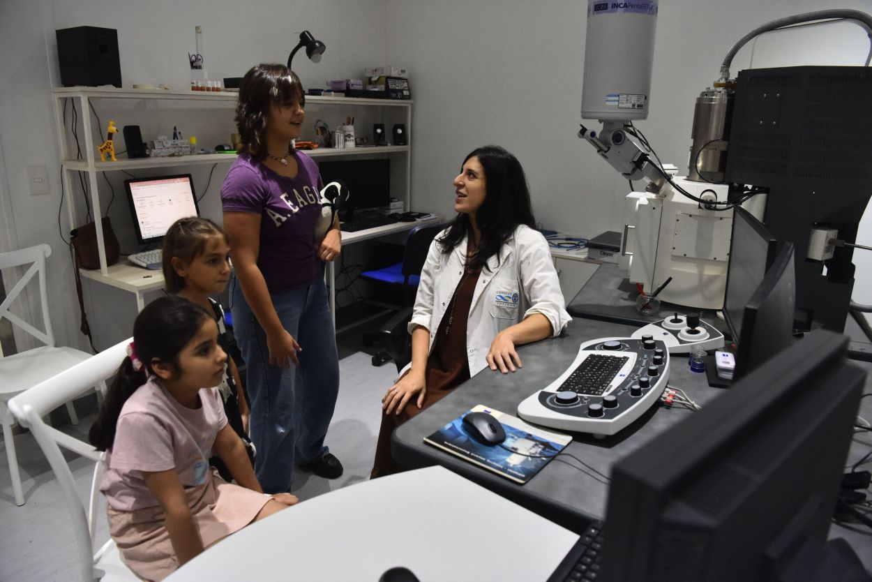 En el circuito del CIME, las niñas pasaron por experiencias guiadas por investigadoras de distintas áreas. Nadia Vega, física y doctora en Ciencias Exactas y Tecnología, llevó a las participantes al universo de lo minúsculo con el microscopio electrónico. En la pantalla, una mosca se volvió gigante y un diente dejó ver “microporos”, según describió. “Las niñas estaban muy sorprendidas. Algo que me llamó la atención fue cómo lograban relacionar lo que veían en el microscopio con cosas de su vida cotidiana”, contó.