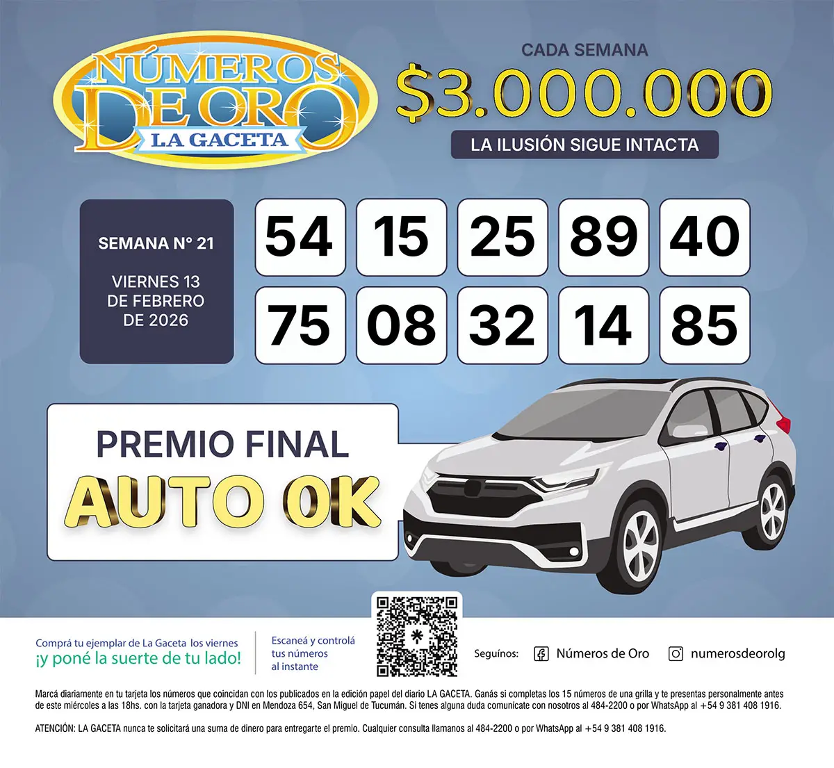 Números de Oro Los Números de Oro de LA GACETA del 13 de febrero de 2026 Compartir Whatsapp Facebook X Copiar dirección URL 13 Febrero 2026 Seguir en Esta nota es de acceso libre. Temas Reforma laboral Buenos AiresNúmeros de Oro de LA GACETAWhatsAppBad Bunny Tamaño texto Comentarios Lo más popular Disfraces prohibidos y bailes en tiempos de guerra: así era el carnaval en Tucumán Más que 100 puntos Parker: el mensaje del vino tucumano que terminó tatuado en el brazo de una joven francesa Números de Oro: tres ganadores que ya piensan qué hacer con sus millones Bad Bunny en Buenos Aires: tres noches que prometen convertirse en historia en River Plate Espectáculos y cultura en Tucumán: guía para salir Cuatro tucumanos hicieron cumbre en el volcán activo más alto del mundo