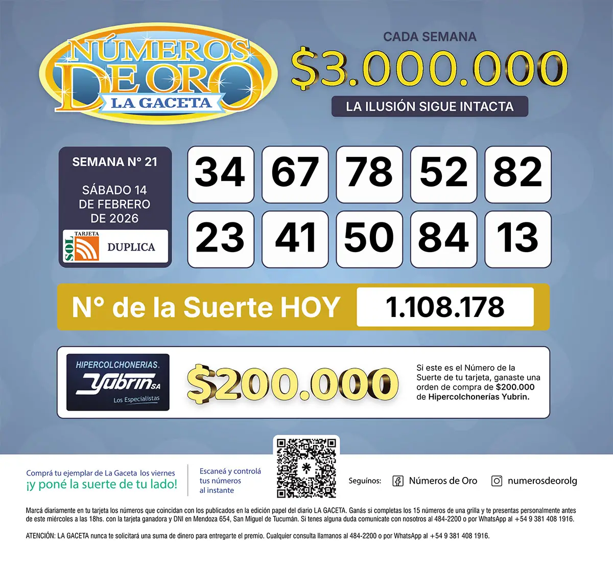 Números de Oro Los Números de Oro de LA GACETA del 14 de febrero de 2026 Compartir Whatsapp Facebook X Copiar dirección URL Hace 6 Hs Seguir en Esta nota es de acceso libre. Temas Policía de TucumánNúmeros de Oro de LA GACETAInterpol Tamaño texto Comentarios Lo más popular Disfraces prohibidos y bailes en tiempos de guerra: así era el carnaval en Tucumán Más que 100 puntos Parker: el mensaje del vino tucumano que terminó tatuado en el brazo de una joven francesa Números de Oro: tres ganadores que ya piensan qué hacer con sus millones Bad Bunny en Buenos Aires: tres noches que prometen convertirse en historia en River Plate Espectáculos y cultura en Tucumán: guía para salir Cuatro tucumanos hicieron cumbre en el volcán activo más alto del mundo