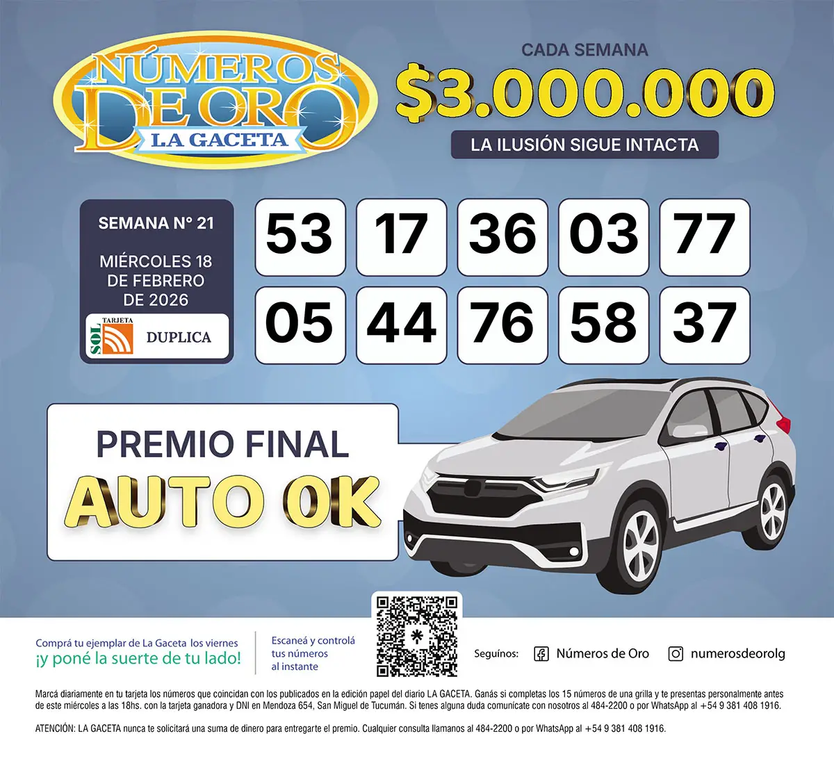 Números de Oro Los Números de Oro de LA GACETA del 18 de febrero de 2026 Compartir Whatsapp Facebook X Copiar dirección URL 18 Febrero 2026 Seguir en Esta nota es de acceso libre. Temas Tafí del ValleNúmeros de Oro de LA GACETAAmaicha del ValleWhatsAppRobert DuvallEstados UnidosArgentina Tamaño texto Comentarios Lo más popular Mirá cómo votaron los diputados tucumanos el proyecto de reforma laboral Reforma laboral: con modificaciones, Diputados votó a favor y el proyecto vuelve al Senado Una defensora prepara una denuncia contra Patricio Ledezma, el joven agredido en Tafí del Valle Sí, tus hijos miran porno y este es el efecto que causa en sus cerebros Seis gobernadores ayudaron para que La Libertad Avanza logre avanzar con la ley de reforma laboral Murió Eric Dane, estrella de Grey’s Anatomy y Euphoria, tras luchar contra una enfermedad devastadora