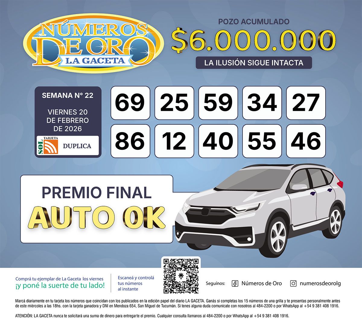 Números de Oro Los Números de Oro de LA GACETA del 20 de febrero de 2026 Compartir Whatsapp Facebook X Copiar dirección URL 20 Febrero 2026 Seguir en Esta nota es de acceso libre. Temas Números de Oro de LA GACETA Tamaño texto Comentarios Lo más popular Milei invitó a Jaldo y a otros nueve gobernadores a Nueva York: la respuesta del mandatario tucumano Idiomas en Filo UNT 2026: cuánto cuestan los cursos y cómo anotarse La UNT dicta la única Maestría en Educación Física para la Salud de Argentina Sharenting en tiempos de deepfake: ¿estamos protegiendo o exponiendo a nuestros hijos? Paulina Lebbos: crónica de una impunidad de dos décadas Narcomexicano: la familia de “El Mencho” reclama su cuerpo ante la fiscalía