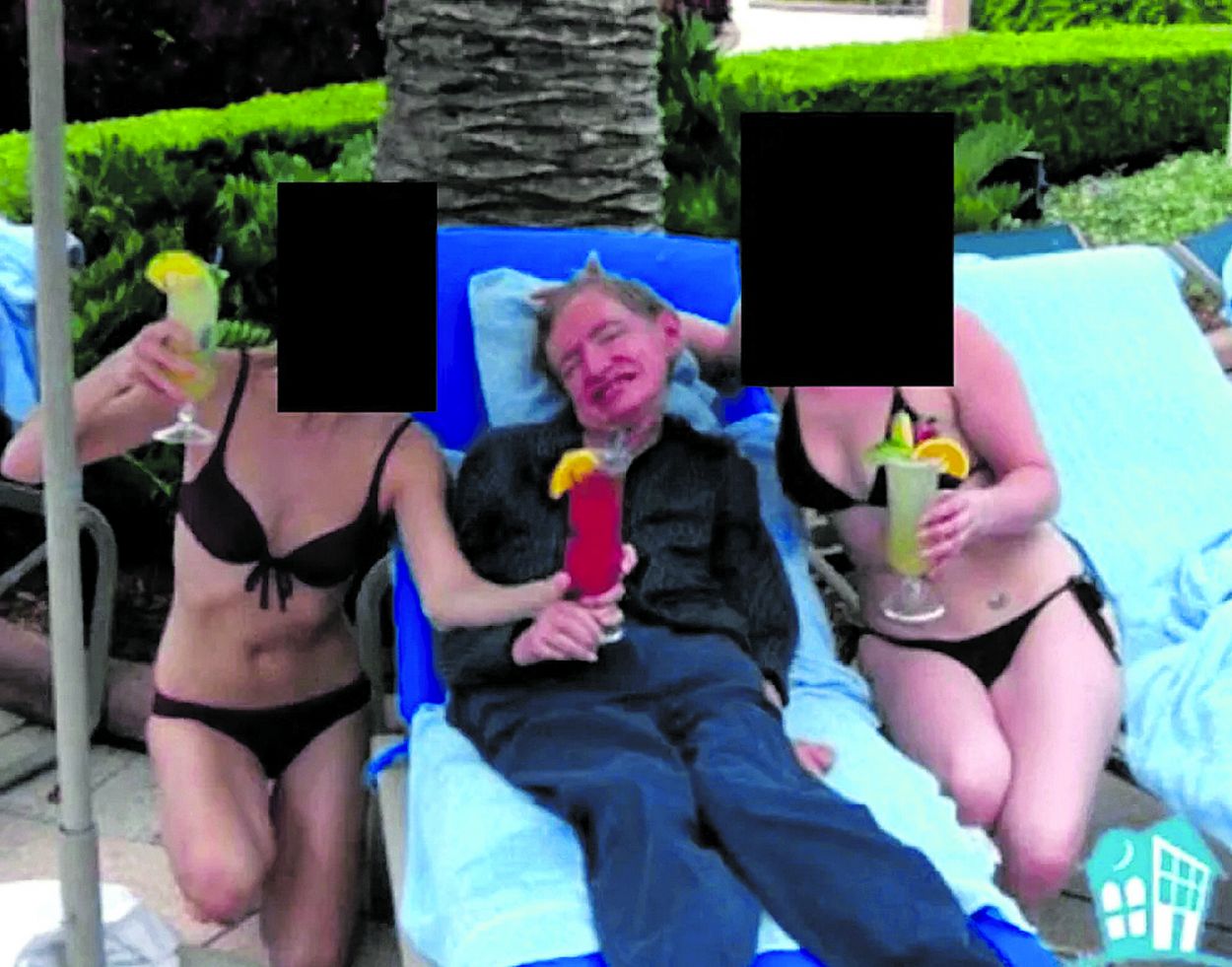 PUBLICADA POR LA PRENSA BRITÁNICA. El científico Stephen Hawking, en la isla del pederasta Jeffrey Epstein, con dos mujeres en bikini.