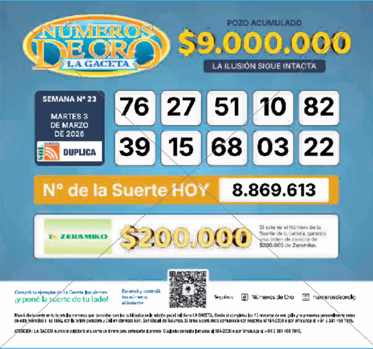 Números de Oro Los Números de Oro de LA GACETA del 3 de marzo de 2026 Compartir Whatsapp Facebook X Copiar dirección URL Hace 8 Hs Seguir en Esta nota es de acceso libre. Temas Números de Oro de LA GACETA Tamaño texto Comentarios NOTICIAS RELACIONADAS Los Números de Oro de LA GACETA del 27 de febrero de 2026 Los Números de Oro de LA GACETA del 24 de febrero de 2026 Lo más popular De Durban a La Ciudadela: El sacerdote sudafricano que conoció a un nuevo “Santo” Milei, más Milei que nunca: el show de poder y los insultos eclipsaron los logros de la gestión Aprende a programar gratis, online y con certificado: el ITBA lanzó 400 becas Ranking en Netflix: qué series están mirando los argentinos Becas en Suiza: cómo estudiar una maestría con apoyo económico Acerca de la guerra lejana y de la ansiedad cercana