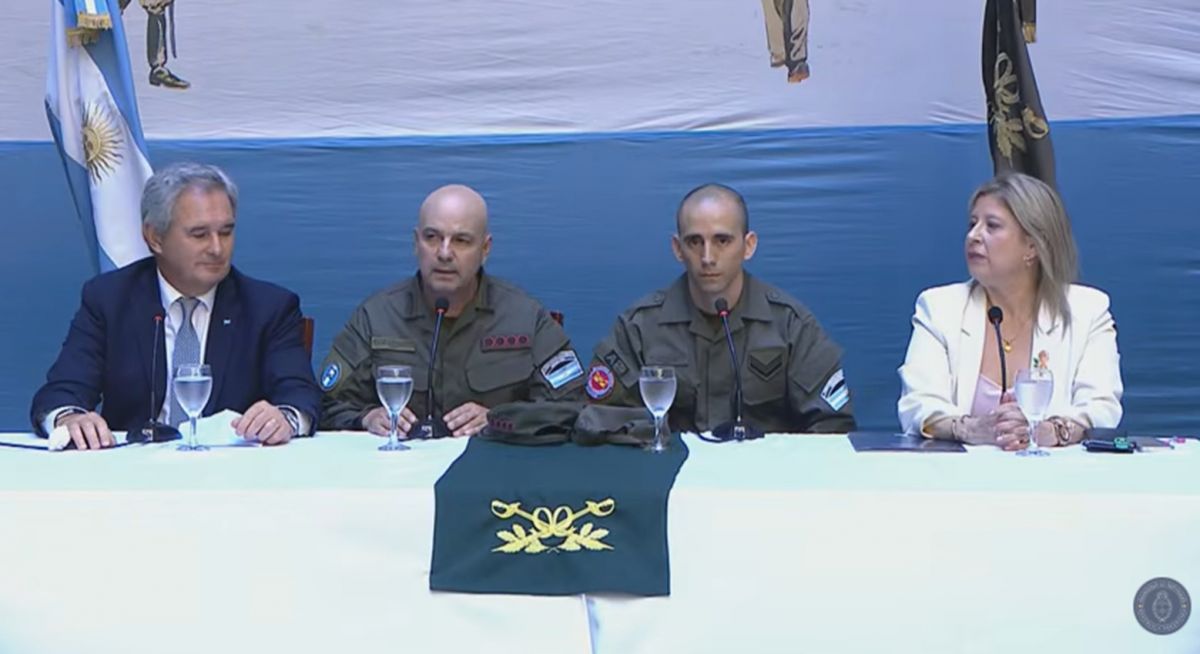 El gendarme estuvo acompañado en la conferencia de prensa por Alejandra Monteoliva, ministra de Seguridad; Pablo Quirno, canciller; y Claudio Brilloni, director nacional de Gendarmería.