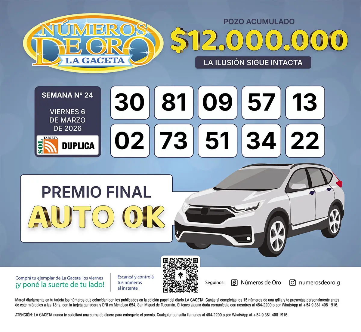 Números de Oro Los Números de Oro de LA GACETA del 6 de marzo de 2026 Compartir Whatsapp Facebook X Copiar dirección URL Hace 7 Hs Seguir en Esta nota es de acceso libre. Temas Números de Oro de LA GACETA Tamaño texto Comentarios NOTICIAS RELACIONADAS Los Números de Oro de LA GACETA del 27 de febrero de 2026 Los Números de Oro de LA GACETA del 3 de marzo de 2026 Lo más popular Las metalúrgicas tucumanas se sostienen gracias a los ingenios y enfrentan un escenario de incertidumbre Reemplazante de Cúneo Libarona: Mahiques promete un servicio de Justicia “libre” El ministro fiscal opina que se debe revisar la sentencia contra dos condenados por abuso sexual Violencia sexual en manada: cómo se construyen esos consensos Los maravillosos viajes de Sara Vallejo recobran vida por medio de 26 fotos El arte tucumano se propone cruzar fronteras con ArtTuc