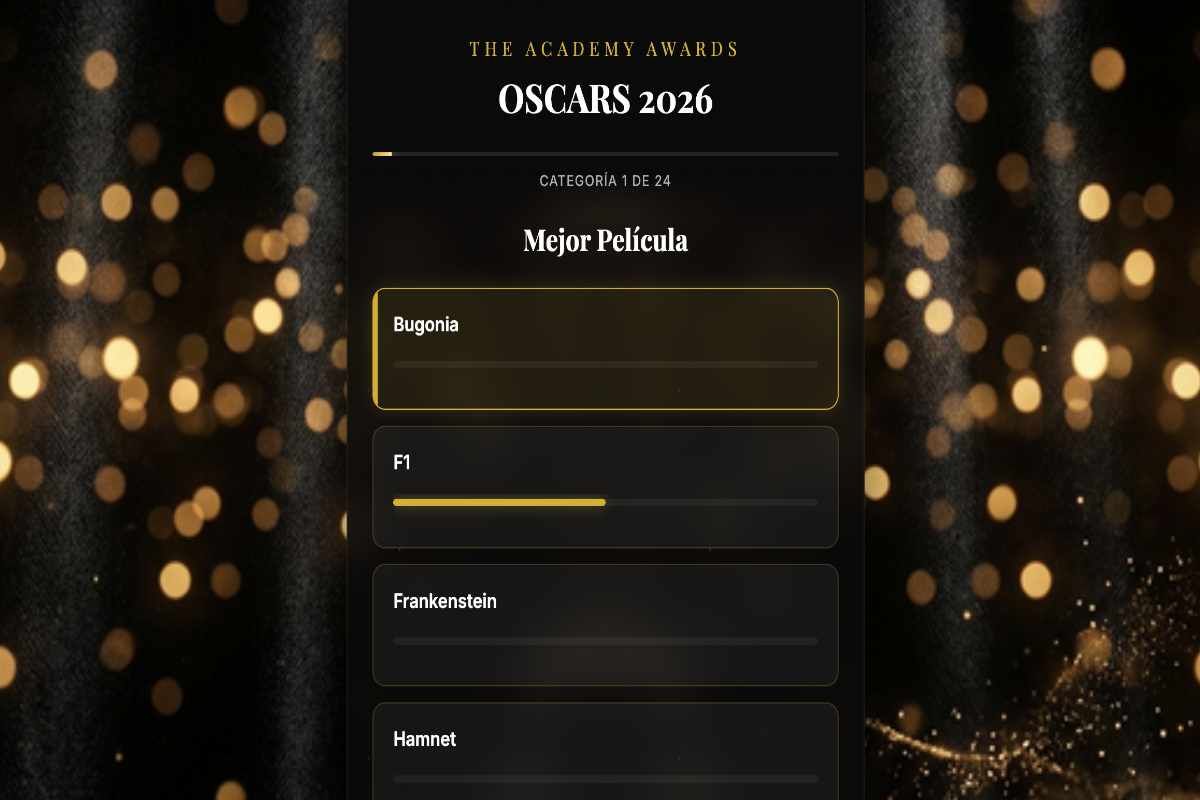 Este fin de semana el mundo del cine pondrá sus ojos en Los Ángeles, y nosotros queremos que seas parte de la conversación. Hoy lanzamos nuestra encuesta interactiva de votación para los premios Oscar 2026, diseñada para que pongas a prueba tus instintos de cineasta y compares tus elecciones con las de miles de personas en tiempo real.