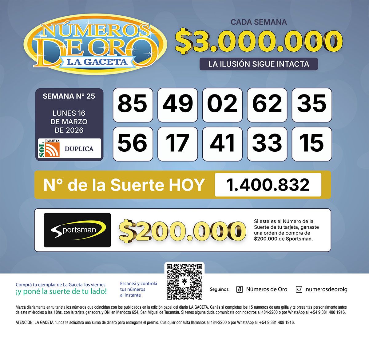 Números de Oro Los Números de Oro de LA GACETA del 16 de marzo de 2026 Compartir Whatsapp Facebook X Copiar dirección URL Hace 7 Hs Seguir en Esta nota es de acceso libre. Temas Números de Oro de LA GACETAWhatsApp Tamaño texto Comentarios Lo más popular Oscars 2026 según tu votación: ¿quiénes serán los dueños de la estatuilla dorada? Aburrirse prepara mejor el cerebro para tomar decisiones complejas El papel higiénico ya no sirve solo para higienizarse y hacer milanesas Vivir en el campo también tiene sus riesgos como en la ciudad El bicarbonato de sodio sirve para mitigar la crisis de precios elevados Las “tierras raras” son cada vez más codiciadas