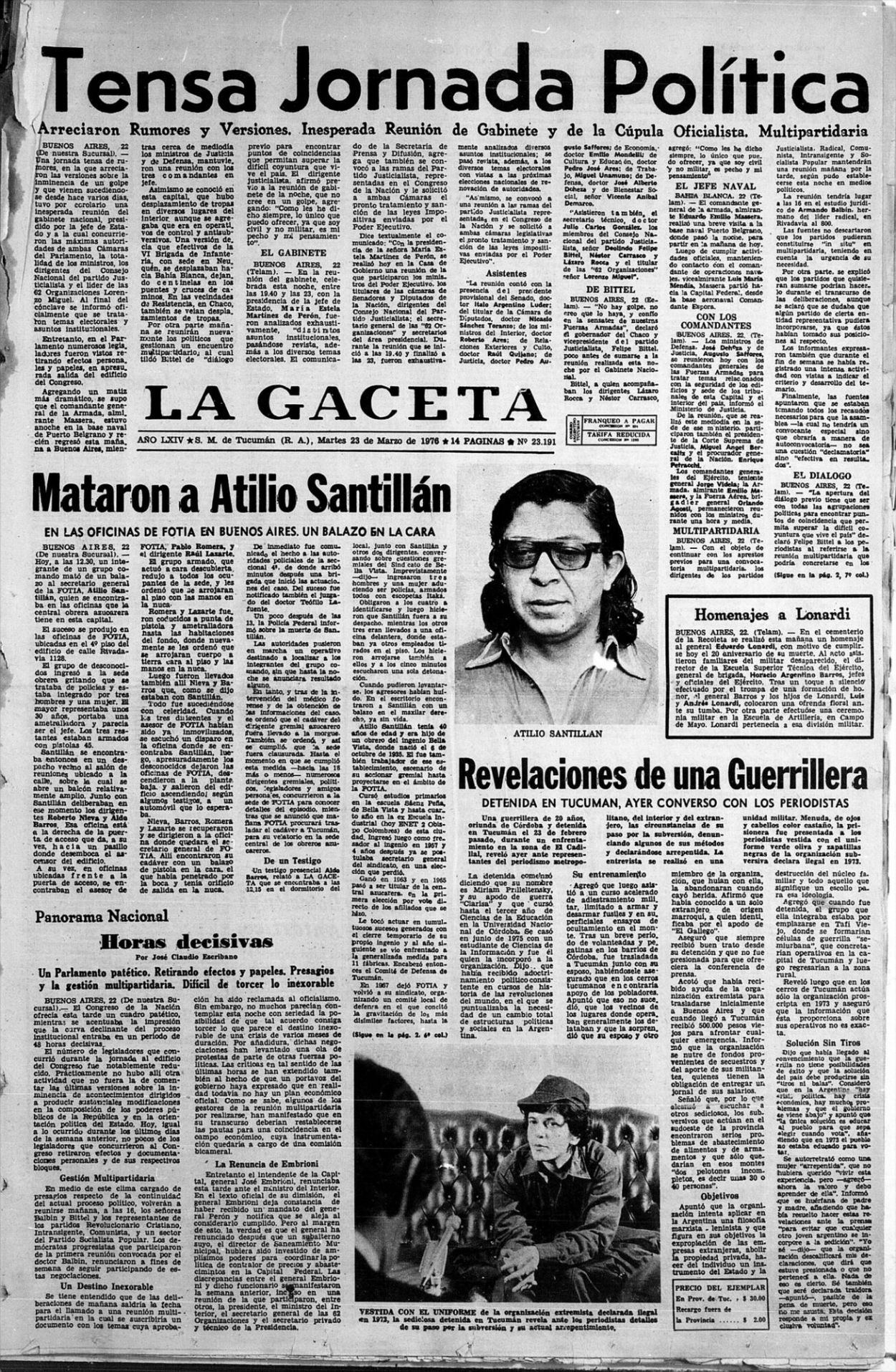 LA TAPA DE LA GACETA. El título reflejaba la incertidumbre reinante aquel lunes 22 de marzo. Debajo, la noticia sobre Atilio Santillán.