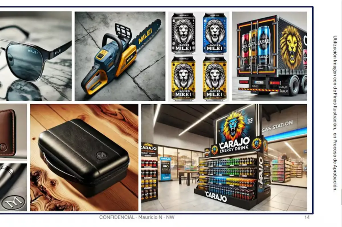 Según la investigación, uno de los proyectos contemplaba la creación de merchandising oficial con la identidad de Milei, que incluía remeras, gorras, mochilas, banderas y hasta bebidas energizantes bajo consignas como “¡Viva la Libertad Carajo!”. Los documentos, elaborados por la firma ICV Advisors, planteaban construir una “marca de estilo de vida” basada en la figura presidencial, con diseño, fabricación y distribución a escala global, en un esquema que excedía la simple comercialización de productos.
