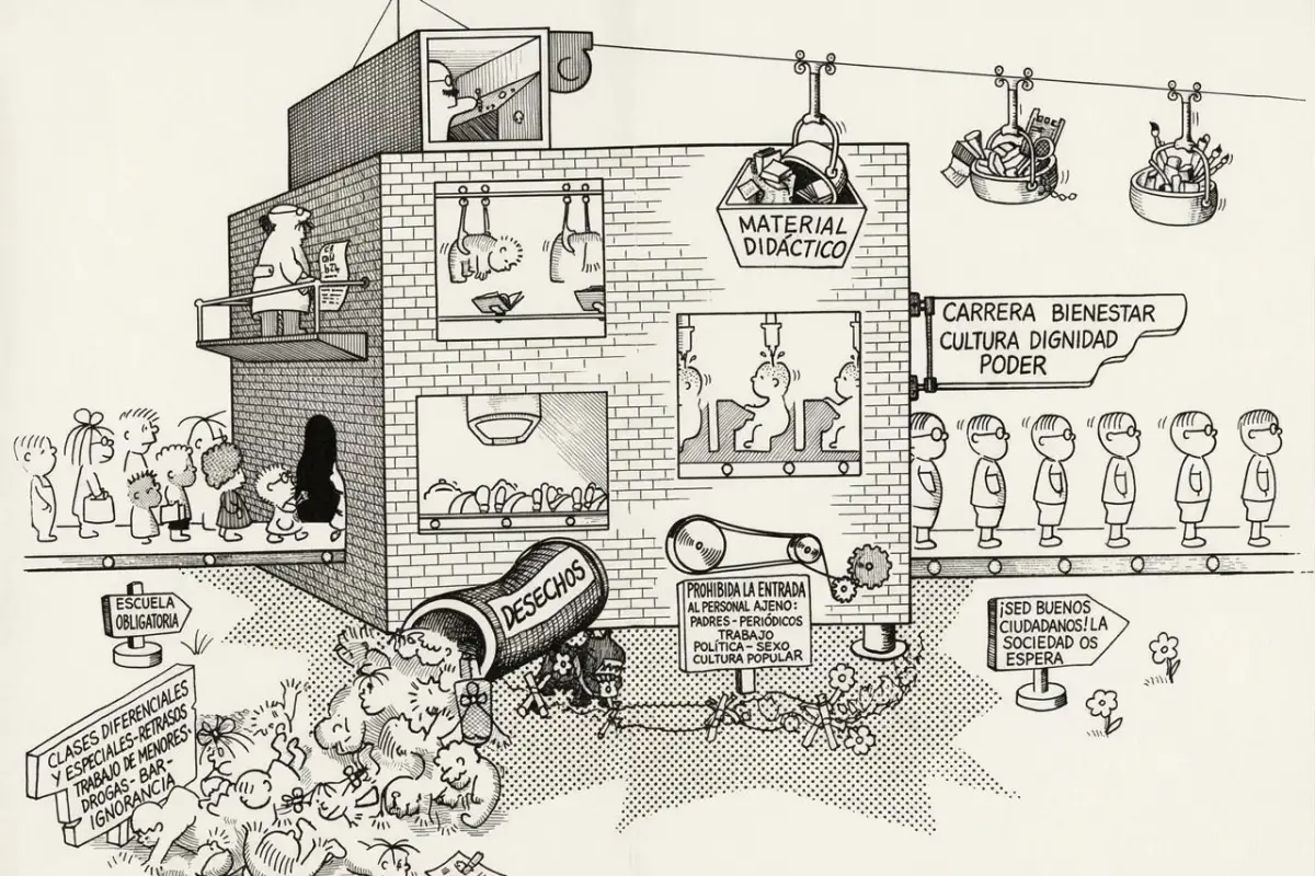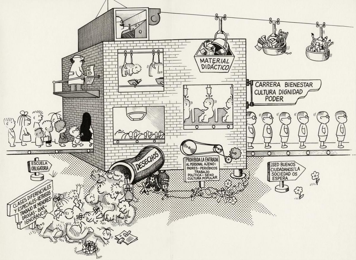 Y me mandó una viñeta histórica del genial Francesco Tonucci (Frato) que no conocía y que ilustra esta nota. Mirala bien. Es una fábrica de ladrillos: entran changuitos todos distintos. La máquina escolar los procesa, los estampa, los nivela, descarta a los que no encajan por el tubo de "desechos", y escupe por la cinta transportadora a una fila de “playmobiles” idénticos, serios y uniformados.