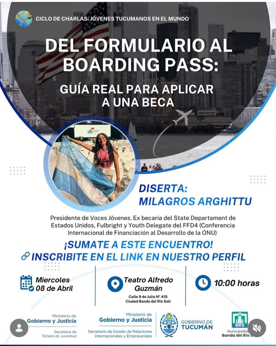 El encuentro se titula “Del formulario al boarding pass: guía real para aplicar a una beca” y se realizará el miércoles 8 de abril, de 10 a 12, en el Teatro Alfredo Guzmán, ubicado en 9 de Julio 415, en Banda del Río Salí. La participación es gratuita, pero requiere inscripción previa.