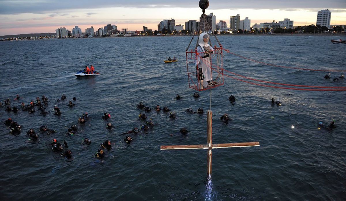• Iniciada en el 2000 y bendecida por el Papa Francisco, la procesión combina tramos terrestres con veteranos de Malvinas y una etapa submarina a 10 metros bajo el mar patagónico.