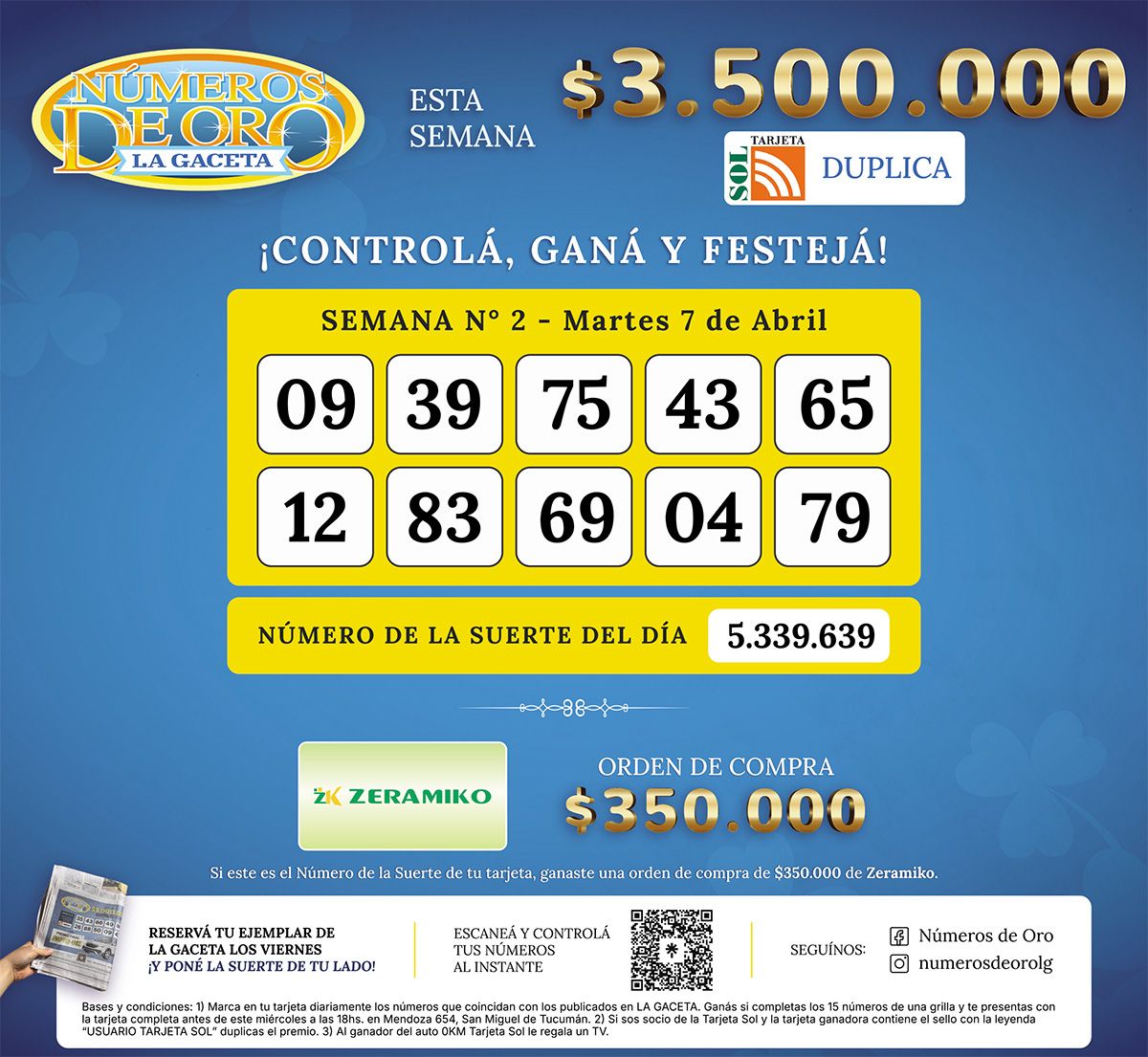 Números de Oro Los Números de Oro de LA GACETA del 7 de abril de 2026 Compartir Whatsapp Facebook X Copiar dirección URL Hace 8 Hs Seguir en Esta nota es de acceso libre. Temas Números de Oro de LA GACETAWhatsAppDefensa Civil Municipal Tamaño texto Comentarios Lo más popular Sin identidad, no hay rumbo: Italia comenzó a perder cuando dejó de ser Italia Probé las versiones pagas de las tres principales inteligencias artificiales y estas son las conclusiones Propuestas de fondo para mejorar la ciudad Cartas de lectores: realidades que muchas veces se ignoran Dos versiones sobre el rescate de un piloto estadounidense caído en Irán Por qué sectores de la extrema izquierda terminan alineados con el terrorismo y el eje iraní