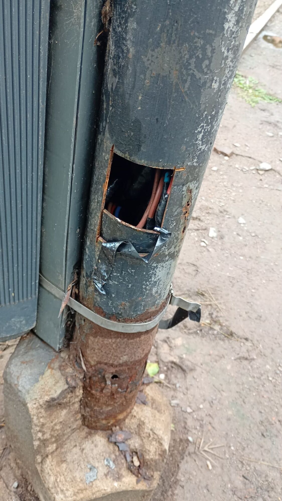 “Este poste está a la par de los juegos de niños. Ya no tiene base de cemento, tiene los cables afuera y tampoco lleva tapa”, contó Juan José.
