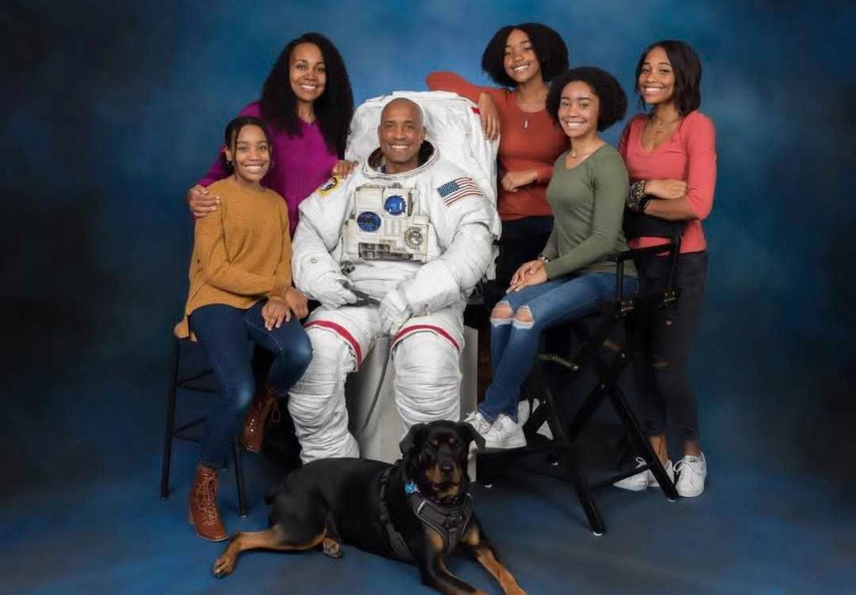 El astronauta Victor Glover junto a sus hijas y esposa. Foto: NASA