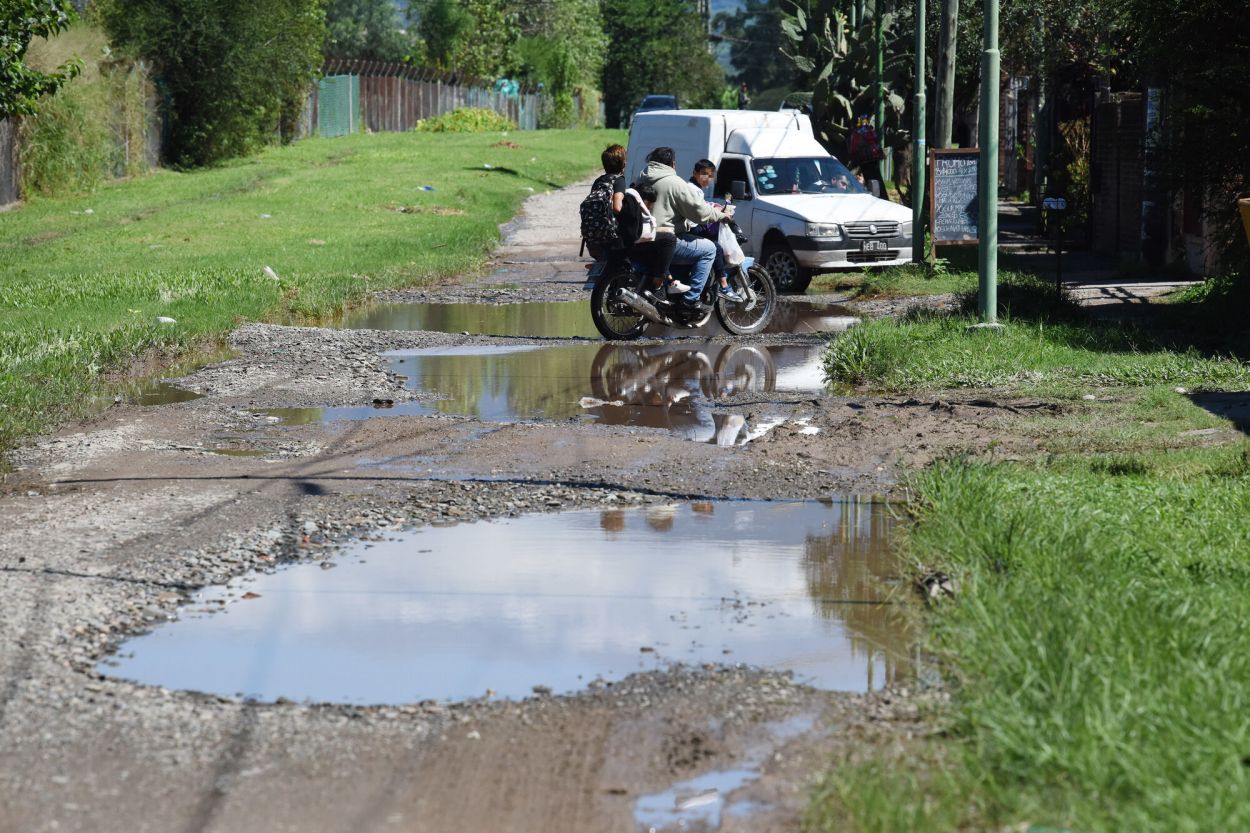 SINUOSO. Los motociclistas esquivan el agua estancada en calle Venecia; los autos evitan pasar por allí. La Gaceta / Fotos de Analía Jaramillo