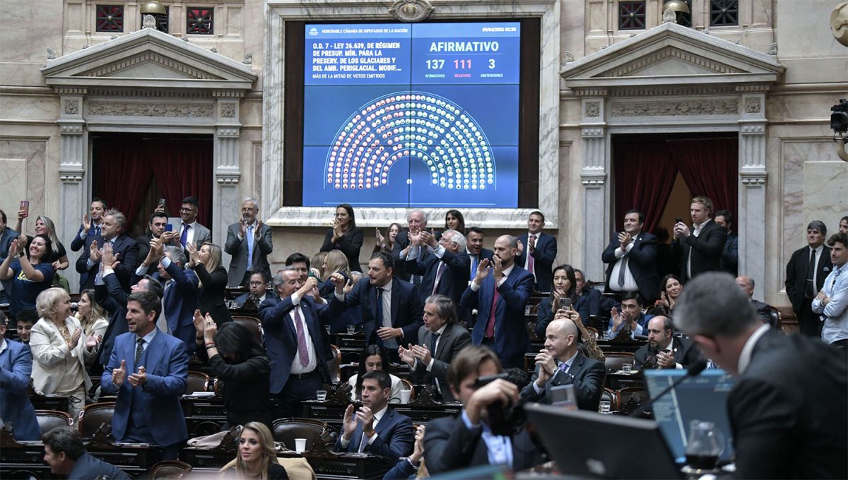 - La Cámara de Diputados aprobó esta madrugada la reforma de la Ley de Glaciares con 137 votos, tras una sesión impulsada por el oficialismo y bloques aliados en el Congreso Nacional.
