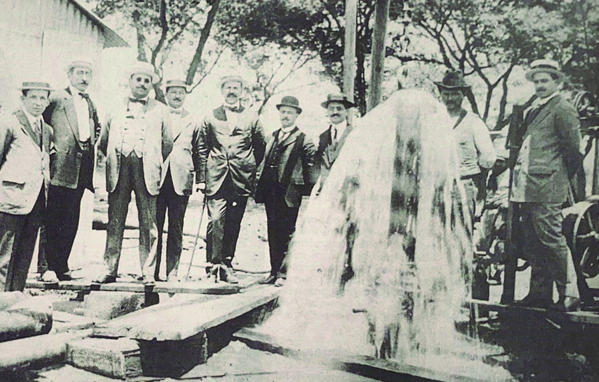 En la imagen se ve al gobernador Padilla, de bastón, cerca del pozo surgente. En carta al rector de la Universidad, Juan B. Terán, le decía, satisfecho, meses después: “En la perforación... se ha dado agua surgente y sale un chorro magnífico de agua riquísima y cristalina. Me parece que es una bendición de Dios, en medio de tan desolada sequía; y, con la presencia de un consuelo espiritual, vive en mi espíritu la sensación del Tucumán tórrido rodeado de fuentes salubérrimas que serenan su ambiente y lo coronan de flores. Lleva a tus hijos a ver eso”.