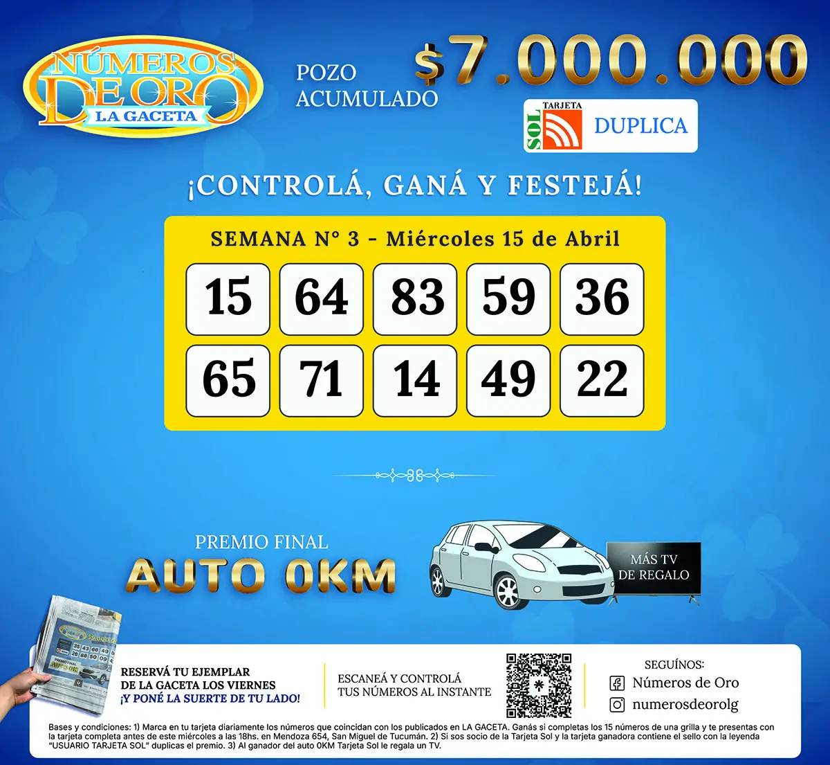 Números de Oro Los Números de Oro de LA GACETA del 15 de abril de 2026 Compartir Whatsapp Facebook X Copiar dirección URL Hace 8 Hs Seguir en Esta nota es de acceso libre. Temas Números de Oro de LA GACETAWhatsApp Tamaño texto Comentarios Lo más popular ¿Qué son las "relaciones de catálogo"? El método que utilizó la Casa Real española para construir la vida de pareja de Felipe VI Nueva edición del Bafici: filmes imperdibles en una cita con el cine independiente Soluciones luego de las inundaciones: Darío Monteros anunció trabajos “inmediatos” en el sur tucumano “El barro no se va”: en La Madrid advierten que la asistencia es insuficiente y piden soluciones Antisemitismo: la memoria frente al relato Proyectarán “Barcos y catedrales” en Espacio Incaa