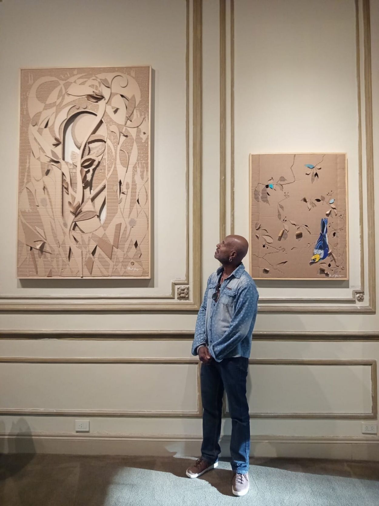 “Agarré la caja, una trincheta, pegamento… y empecé a cortar. A tallar el cartón. A mirar las formas que ya estaban ahí”. La primera obra surgió de ese gesto exploratorio. Después vino lo que él describe como una cadena inevitable: “cuando estás produciendo, siempre aparece la idea siguiente. Y después otra. Y otra”.