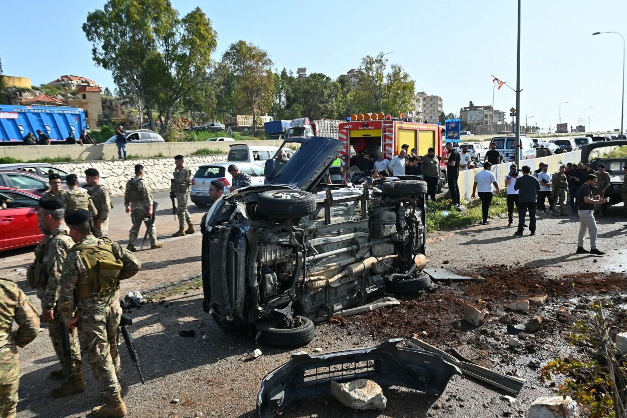 BOMBAS ISRAELÍES. Soldados del ejército libanés aseguran el lugar de un ataque con aviones no tripulados que impactó en la ruta de Saadiyat.