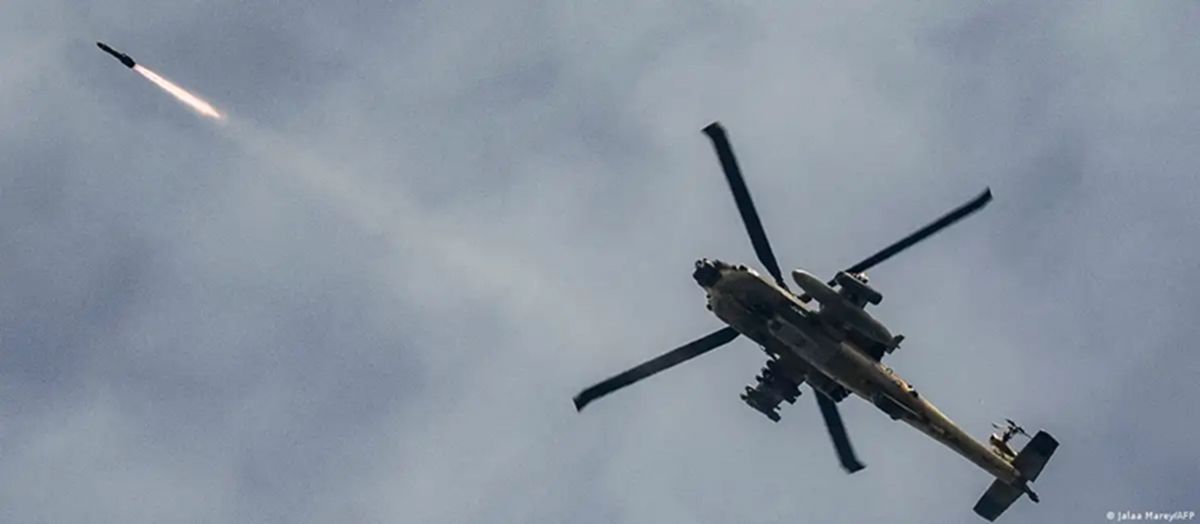 Helicóptero israelí disparando un proyectil en la frontera con Líbano. DW (Jalaa Marey/AFP)