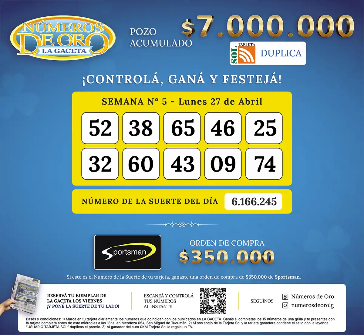 Números de Oro Los Números de Oro de LA GACETA del 27 de abril de 2026 Compartir Whatsapp Facebook X Copiar dirección URL Hace 8 Hs Seguir en Esta nota es de acceso libre. Temas Números de Oro de LA GACETAWhatsAppArgentina Tamaño texto Comentarios Lo más popular El especial tiene nombres fuertes y promesa de emoción en el turf local "Teen takeovers": el fenómeno juvenil que preocupa a ciudades de EE. UU. ¿Querés estudiar en una universidad de EE.UU.? Así podés postularte gratis El francés de Tucumán se destaca: el Lola Mora y la UNT, dos de nueve con sello Argentina Francófona La fuerte caída del consumo genera problemas en los alquileres: "Hay muchos vendedores, pero pocos profesionales" Ranking notas premium “Nos convierten poco, pero debemos ser más precisos”: la autocrítica de “Fosa” Ferreyra en San Martín Matías Orlando, tras el bajón de Tarucas: “No cambiamos nuestra forma de trabajar” La mentira del paladar negro en el fútbol argentino: al hincha sólo importa ganar Las pantallas que podrían ser medicina para el cerebro El ex defensor del Pueblo Eduardo Cobos desmiente las cifras de empleados que se difunden