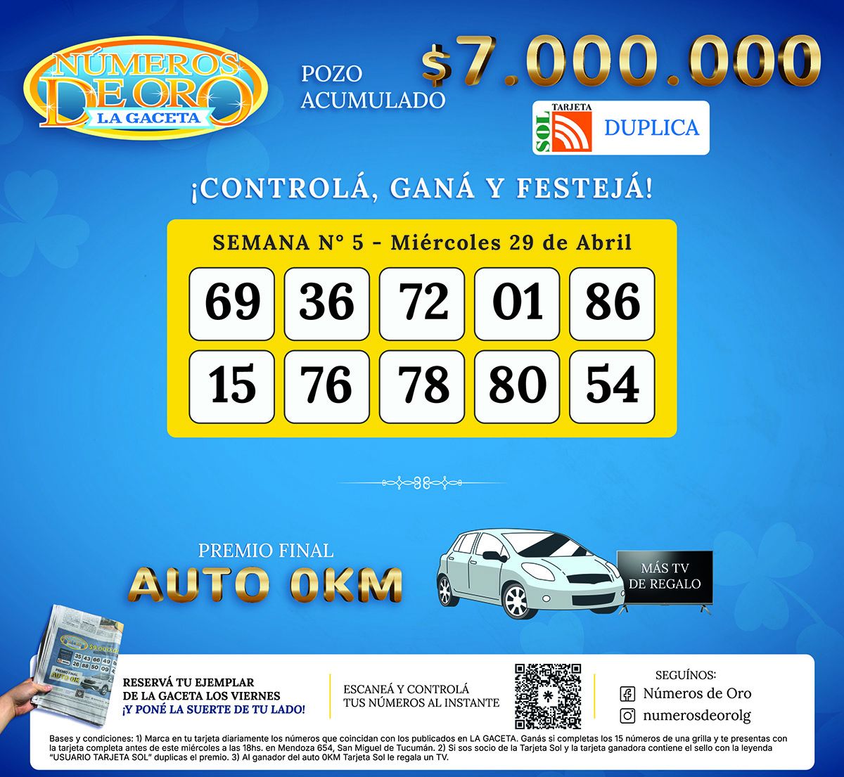 Números de Oro Los Números de Oro de LA GACETA del 29 de abril de 2026 Compartir Whatsapp Facebook X Copiar dirección URL Hace 5 Hs Seguir en Esta nota es de acceso libre. Temas Números de Oro de LA GACETA Tamaño texto Comentarios Lo más popular Videojuegos en familia: un estudio revela que derriban el estereotipo del vicio y democratizan la crianza Duolingo amplía sus cursos gratuitos: cuáles son los idiomas y cómo acceder Cuando el principal obstáculo no es el dinero: la clave para acceder a la casa propia en 12 meses Huxe: cómo funciona la app que convierte tu día en un podcast personalizado Netflix ya puso fecha a “Carísima”, la serie de Caro Pardíaco Ranking notas premium La Legislatura debatirá "Ficha Limpia" este jueves: ¿Quiénes no podrían ser candidatos? Por qué la derrota es una señal de alarma para San Martín: quedaron al descubierto problemas que venía arrastrando Jaldo se ubica en el centro del cuadrilátero político Amenazas, memes y una violencia que se vuelve costumbre Las PASO en el quirófano: ¿ahorro fiscal o cepo a la interna?