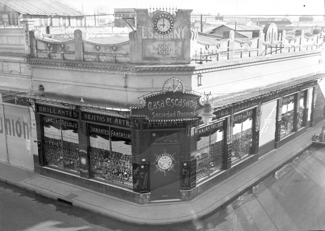 Los españoles Manuel y José Escasany tenían dos negocios de joyería y relojería exitosos en Buenos Aires desde 1896. En 1905 inauguraron en Tucumán la primera sucursal. Fue en la esquina noroeste de San Martín y Muñecas, en el sitio donde antes había funcionado una carnicería. La nueva joyería fue un comercio muy lujoso, de amplias vidrieras, trabajada marquesina de cristal y profusión de foquitos de colores. Se volvieron muy populares. En 1916 hicieron un libro del Centenario con fotos de Tucumán que regalaron a sus clientes. Ellos impusieron la costumbre de poner en vidriera el precio de cada artículo. Con el tiempo el local les resultó chico; lo demolieron y levantaron un edificio neoespañol que hoy sobrevive. Nueve relojes en la entrada daban la hora en varias ciudades y el del centro daba “la hora exacta”. Había otro reloj al tope de la torre, al que en 1949 le conectaron un carrillón que daba toques sonoros cada cuarto de hora.