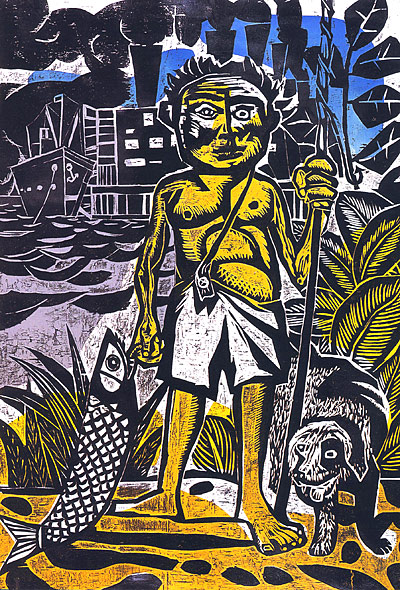 “JUANITO CON PESCADO”. La obra está realizada con la técnica del xilocollage sobre papel, y fue realizado en 1961 por el artista rosarino.