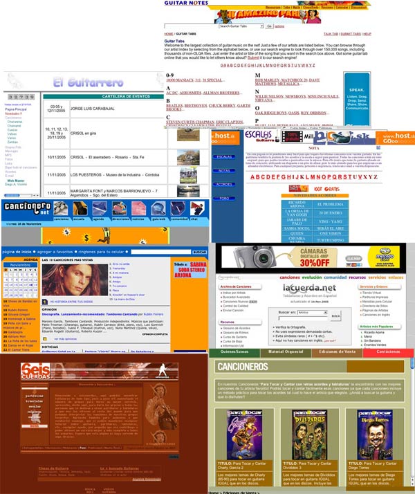 Guitar Notes (www.guitarnotes.com/olga): uno de los sitios en inglés más importantes donde se puede encontrar unas 150.000 letras y notas para guitarra y bajo de los más destacados artistas y bandas internacionales. Su presentación es simple y básica. No cuenta con animaciones en flash, ni un listado de secciones. Sino el nombre de los artistas ordenado alfabéticamente. Se pueden encontrar los últimos hits de Green Day, Codplay, hasta The Beatles y Beethoven.