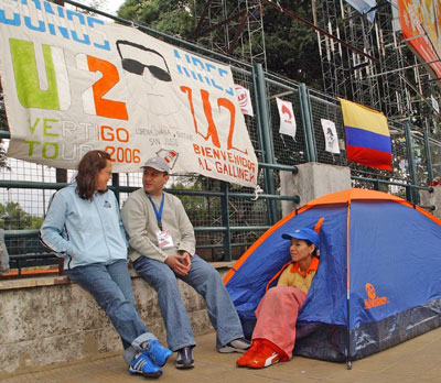 En medio de un clima tranquilo y amigable, los seguidores de la banda irlandesa se acomodaron en las puertas de River, expectantes y emocionados, para ver al "mejor grupo de rock que hay", según dijo Miriam, de 24 años, que está desde el lunes frente al estadio junto con un grupo de chicos de Tucumán, de Bahía Blanca, de San Martín y de Buenos Aires. "U2 es todo; es mi vida, es mi religión", afirmó, tras asegurar que a través de internet se conectaron con muchos fans de todo el país para que vengan a verlos e hicieron remeras con la inscripción de la banda.