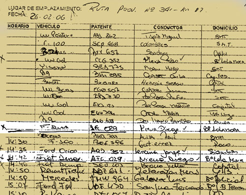 A través de las planillas, además, los investigadores detectaron que dos automóviles, un VW Polo, conducido por Luis Nieva, y un Ford Orion, manejado por Jorge Lencina, circularon por allí el 27 de febrero y el 6 de marzo con la misma chapa patente: BTB-300. Se desconoce si este Lencina es familiar del policía que está detenido. Otro Nieva (en la planilla no dice cuál de ellos) aparece manejando un Ford Orion, pero esta vez con la patente AOD-352.