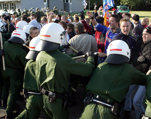 GUERRA DE LOS MUNDOS. La Policía de un lado; los hooligans del otro. Buscan impedir el ingreso de los ingleses por la frontera polaca.(DPA)