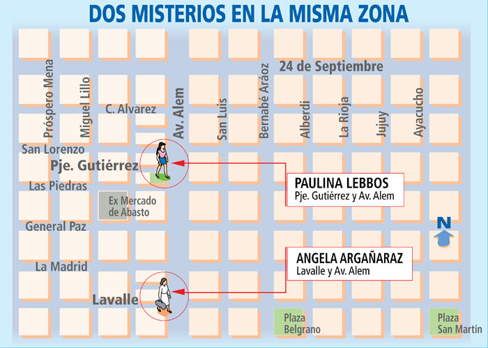 Casi cuatro cuadras separan un hecho del otro. El 26 de febrero, Paulina Lebbos desapareció, después de haber tomado un remise en la esquina de Alem y pasaje Gutiérrez, en la zona del Abasto. El lunes 31 de julio, Angela Beatriz Argañaraz desapareció luego de haber tomado un auto de aquiler en la esquina de Lavalle y Alem. Muchos de los encargados de la investigación de este último caso no quieren hablar de ellos, pero saben bien que una relación entre ambos hechos es inevitable.